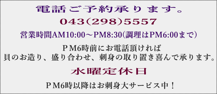 守るべき日本の食文化 ~旬の魚、野菜をたべることのすすめ~戦後の日本、アメリカナイズされたものの考えや食材の流入、農薬使用のすすめ、また工業化にともない人間の都合の良いように保存料や着色料を使用し作られた加工食品等、食べ物の多様化によりアレルギーや現代病が出始めたと考えられます。 やはり何事も初めや基本にもどり日本人が食してきた和食をお薦めしていきたいと思います。 というと、島国、日本に欠かせないのが魚であります。 大自然の恵みであります魚は、四季折々をその旬を代表する魚にて味わえ、加えてその時々の旬の魚は、旬の時期がもっともうまみ成分のグルタミン酸やDHAの含有量や栄養価が一番高いとされています。特にDHAはアレルギーに対して抵抗力をつける効果があると実証されており、いまを生きていく我々には欠かせない栄養素と考えられます。 魚に塩や味噌、醤油、酒といったものを使用調理し、油や化学保存料に頼らなかった日本食の基本を取り戻し、強い日本人を目指しましょう! というわけで、当店、海鮮恵ではDHA含有量の一番多いとされるまぐろを中心として、その他、旬の魚を取り揃え、調理方法を説明し皆様においしく魚を食べて頂きたいと日々努力しております。 美味しいお魚を食べたい人、是非よってみて下さい。外食するなら当店で盛り合わせを頼んでみて下さい。 海鮮恵 店 主